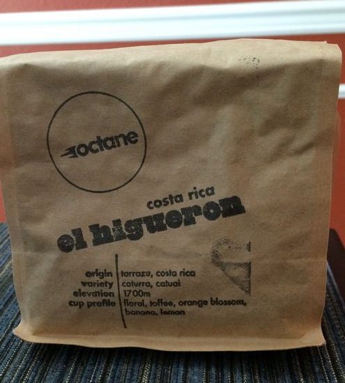 Octane Coffee is an Atlanta-based company that has been in operation for 12 years, but has expanded into roasting and wholesale coffee in the last 4 years. They have cafes in three states: Georgia, Alabama, and West Virginia. Their website doesn’t feature their single-origin coffees, probably since they don’t even offer the option of online purchasing, but it does list coffees that are available wholesale. I only mention it since the names are amusing to me: Super Regular, White Lightning, and Gravy. I picked up this bag at their Homewood location in Birmingham, Alabama, and decided on this bag of Costa Rican coffee because it was in the optimal freshness window and the tasting notes sounded intriguing. Keeping an open mind as best as I can!