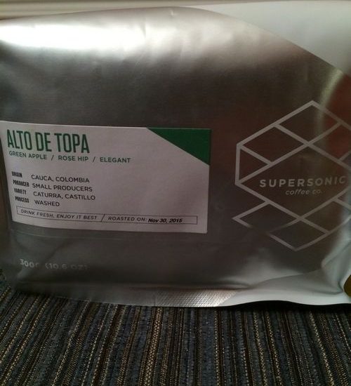 Supersonic Coffee, based in northern California, currently does not have a storefront (they are working on opening their own coffee bar) but their beans are available wholesale, online, and at a number of coffee shops around the country. I’ve been wanting to pick up a bag of their coffee for some time now, since I saw Houndstooth Coffee in Dallas starting to carry their beans, and I finally got an opportunity this week. Bonus, the bag came with a free Britpop earworm!