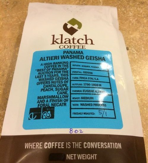 I recently got an email alert that Klatch was offering a sale on Geisha coffee, and it took me approximately 0.02 seconds to click the link to start browsing! The price of this coffee has been reduced from $39.95 to $29.95 for 8 ounces… it’s still expensive, clearly, but I thought it would be worth a try. Klatch has clear notes about roast dates for coffees this special – this Panama Geisha is only roasted on Mondays, and I have a feeling it won’t be offered for very much longer. I ordered this coffee the week of May 1, and at the time they were also offering a Panama Altieri Natural Geisha, but that’s no longer on the site. Jump on this ASAP if you want to try it.