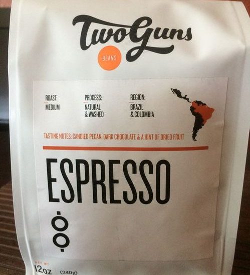 Two Guns’ beans are roasted by Dillanos Coffee Roasters (Sumner, Washington). As far as I can tell from poking around both companies’ sites, there’s no way to purchase the Two Guns Espresso Blend online, but you can get them at Two Guns’ shop locations.