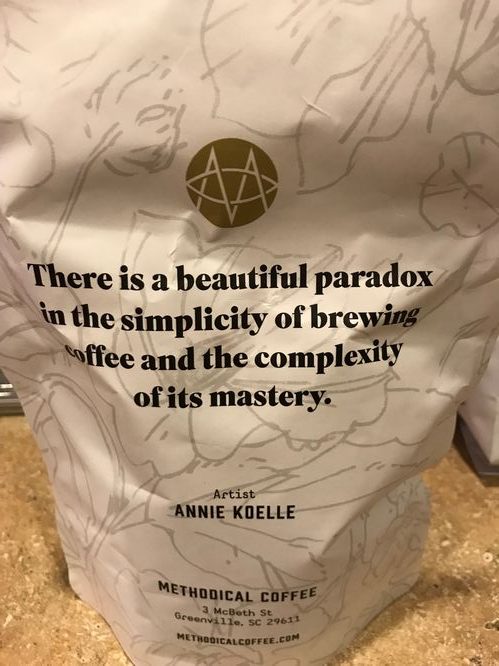 There’s no real system I follow when choosing coffees to review; some are sent to me by roasters, some are gifts from friends, some are coffees I seek out and buy directly from roasters’ locations or websites, and some just jump into my path while visiting coffee shops at home or in my travels. This bag from Methodical Coffee is in the last category. I travel to Tyler, Texas a few times a year and my favorite coffee shop there is the Foundry Coffee House – I’m always happy getting a Kalita Wave pourover of whatever coffee they are featuring that day. The Foundry largely features Texas roasters like local Tyler roaster Porch Culture and Oak Cliff Coffee Roasters out of Dallas, but in recent months, I’ve seen them branching out and featuring roasters from out of state, notably Madcap out of Michigan and most recently, this particular bag from Methodical Coffee from South Carolina.