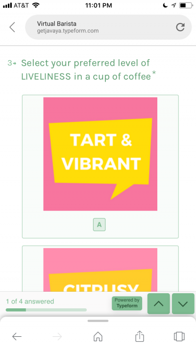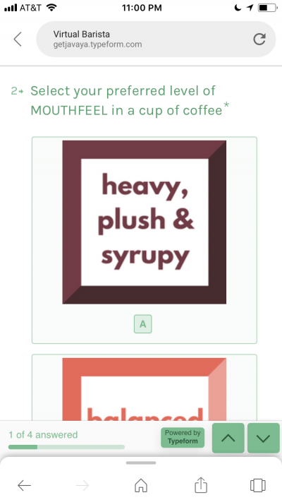 Here’s how it goes: You start on the home page and click “Find Your Perfect Roast” which will take you to their Virtual Barista page. The Virtual Barista will ask you 3 questions which will help them determine what makes up your ideal cup of coffee. The format reminds me a bit of a Buzzfeed quiz, with the square boxes and fun fonts/colors.