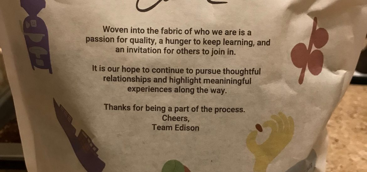 This bag came into my life unexpectedly when two lovely friends of mine surprised me with this coffee! They knew I was very impressed with Edison Coffee Co. the last time I tried their beans, and their local coffee shop features Edison. Such a sweet gesture!
