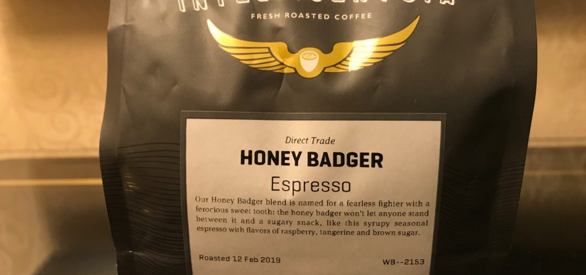 During my short visit to Chicago in February, I popped into Intelligentsia Coffee’s Monadnock location and picked up this bag of their Honey Badger Espresso. They had lots of really fresh beans that day, but I was curious to see if I would like this better than their Black Cat Classic.